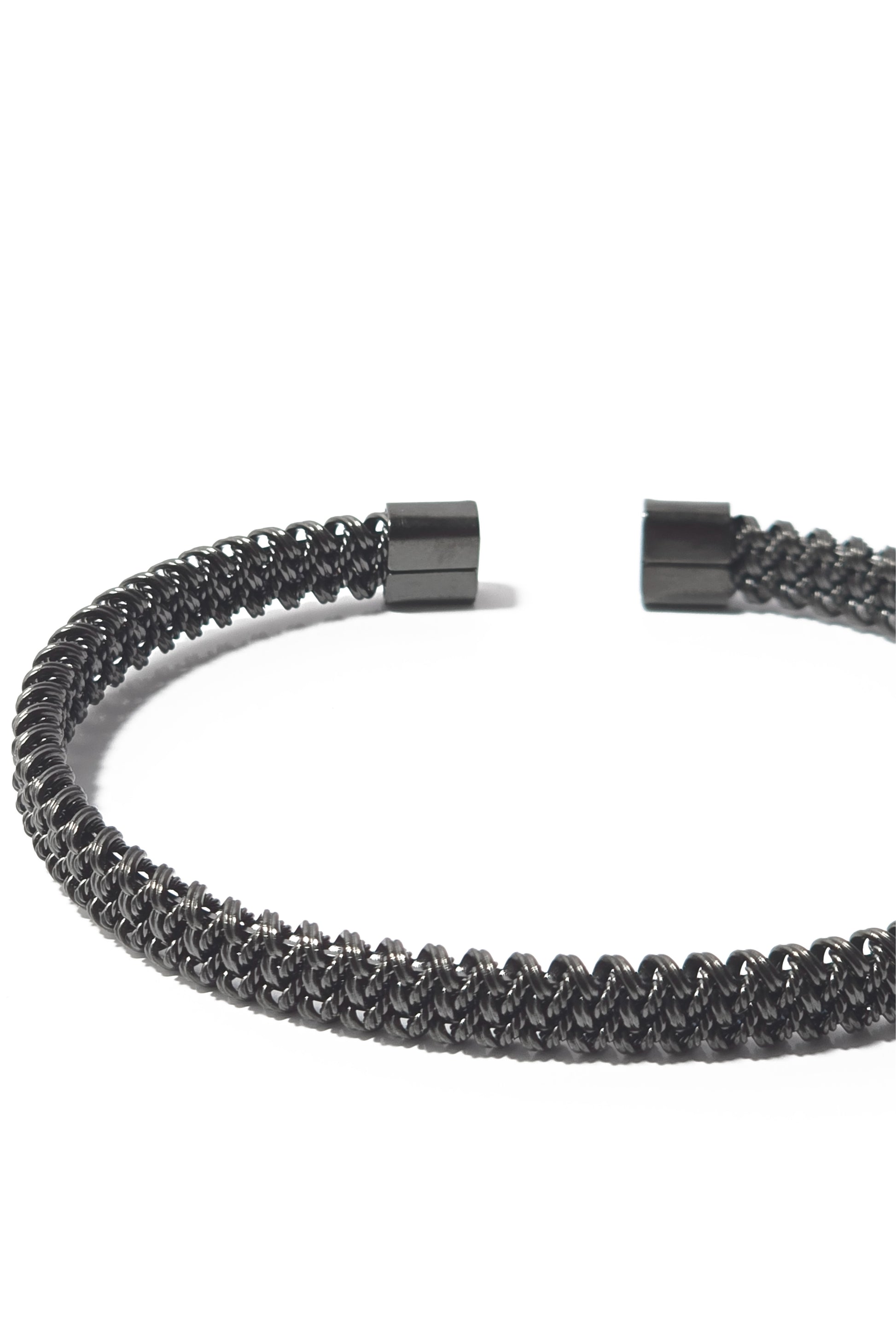 A sophisticated piece with a refined, dark edge. This cuff bracelet is crafted from anti-tarnish stainless steel with a unique gunmetal finish. The intricate mesh weave creates a bold, textured look that stands out without being loud. Its open-cuff design offers a comfortable, flexible fit, while the dark tone adds a subtle rebellion to your style. Designed for durability and a lasting finish, this bracelet is an essential for any modern minimalist wardrobe.
